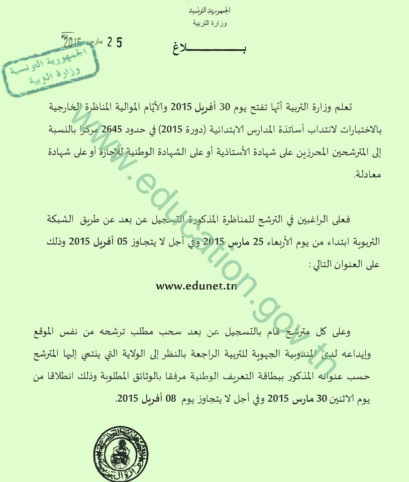 أعلنت وزارة التربية عن فتح مناظرة خارجية بالاختبارات بداية من 30 أفريل، لانتداب أساتذة المدارس الابتدائي (دورة 2015) في حدود 2645 مركزا بالنسبة إلى المترشحين المحرزين على شهادة الأستاذية أو على الشهادة الوطنية للإجازة أو على شهادة معادلة.